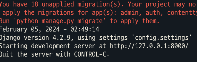 - 터미널에서 작성된 (http://127.0.0.1:8000/)를 컨트롤 + 클릭하면 해당서버의 웹페이지가 열림
