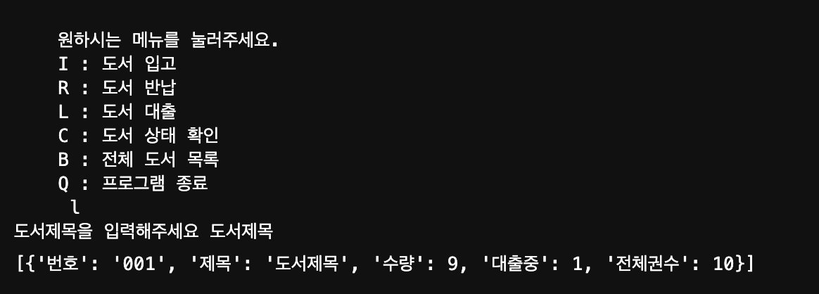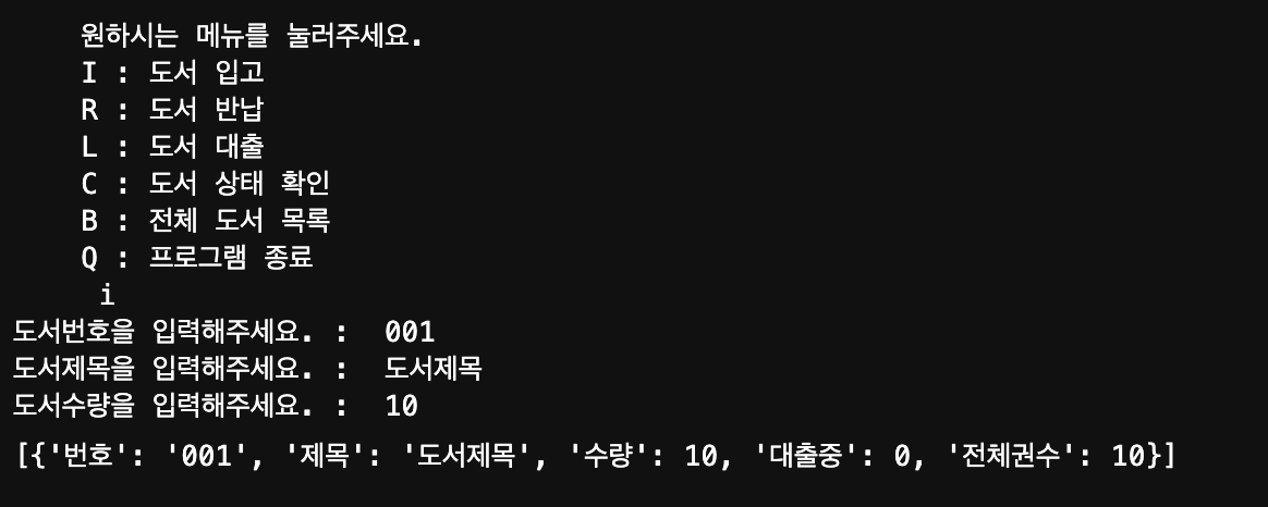제어문 while을 사용하였고, i가 list의 길이보다 크다면 중복되는 게 없으므로 등록되지 않는 도서라고 print 하였다.